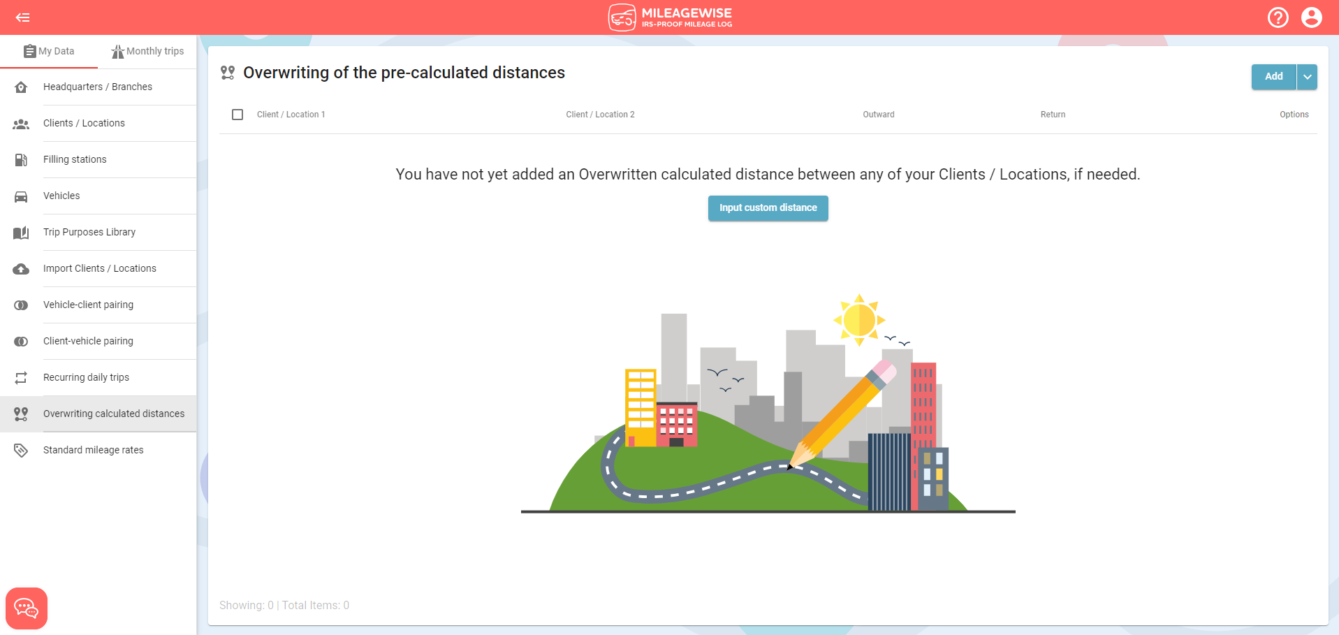 - After overwriting the calculated distances, the distance between the two clients will be the latter set value. This will happen regardless of the type of trip entered in the mileage log (mobile app, fixed trip, recurring daily trip, AI Wizard-generated trip, refueling / charging, or an imported fixed trip).