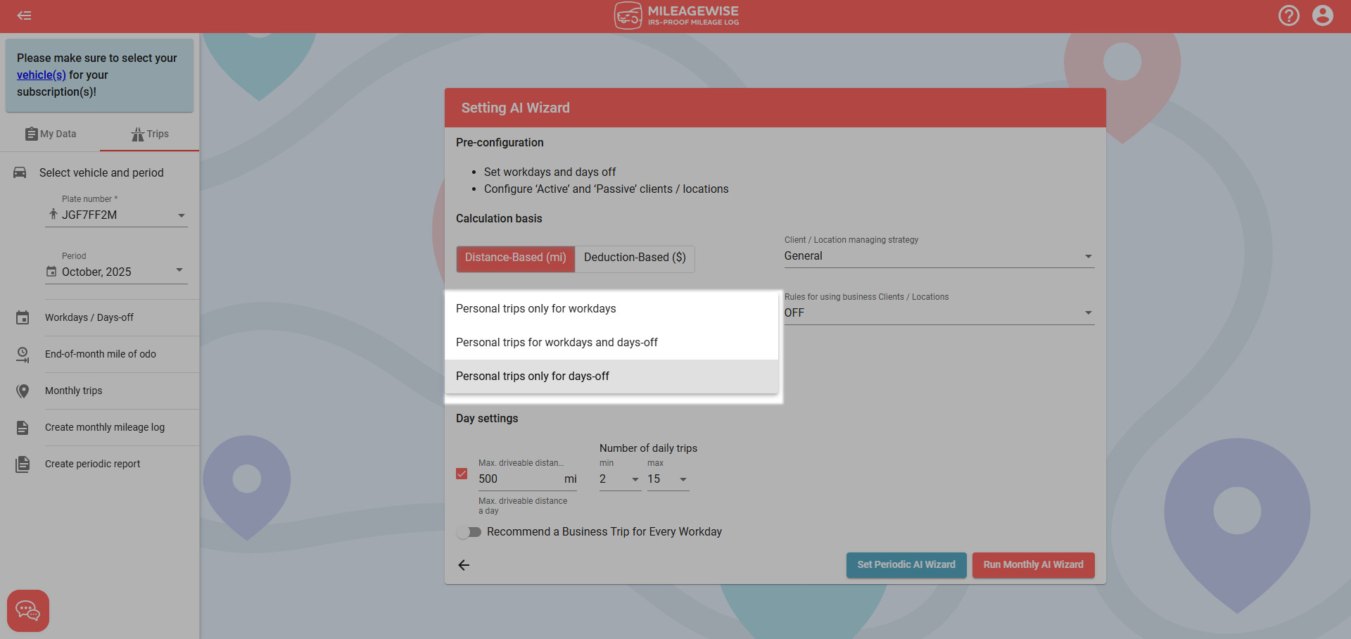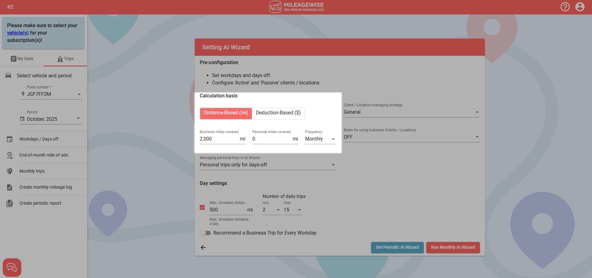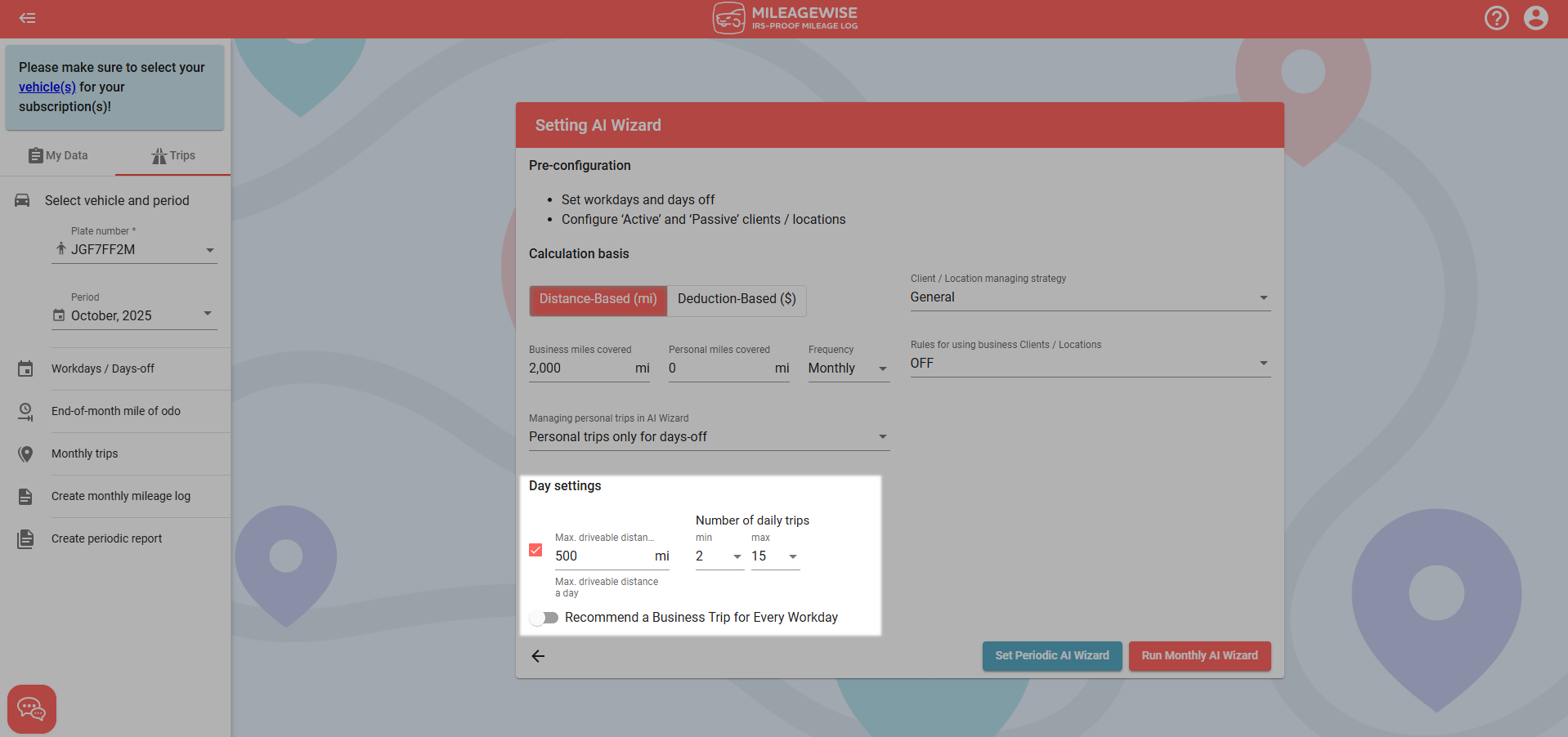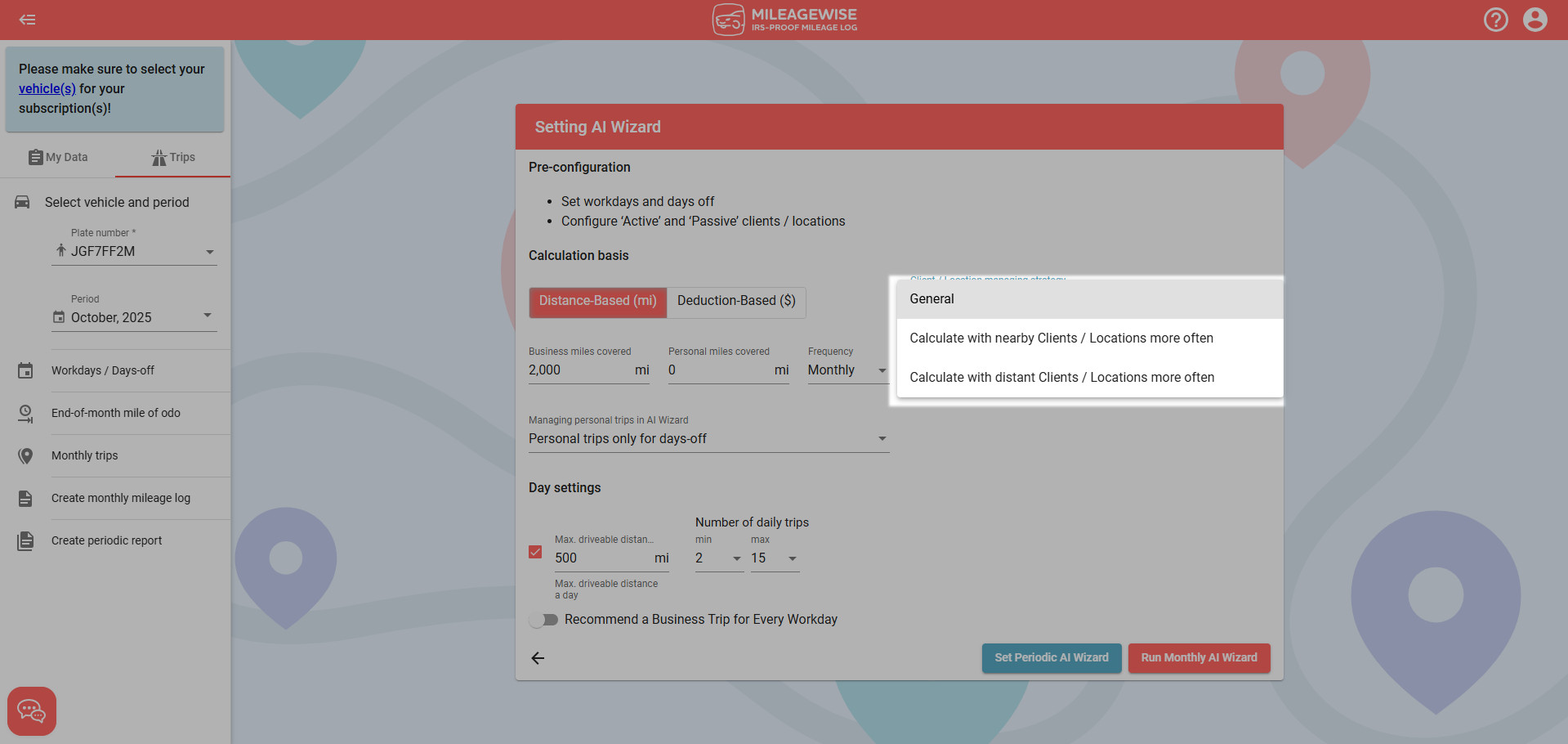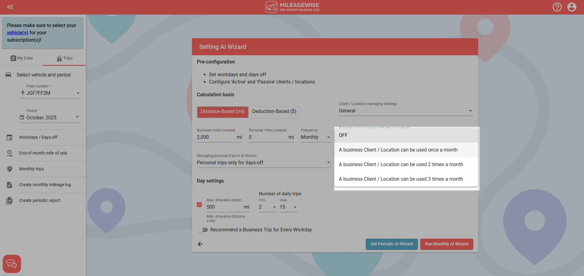 If the frequency of your client visits is irrelevant to you, you can turn this option off. In this case, the AI Wizard feature will work with a random client-visit frequency. This, of course, doesn’t mean that you will end up with a random mileage log.
