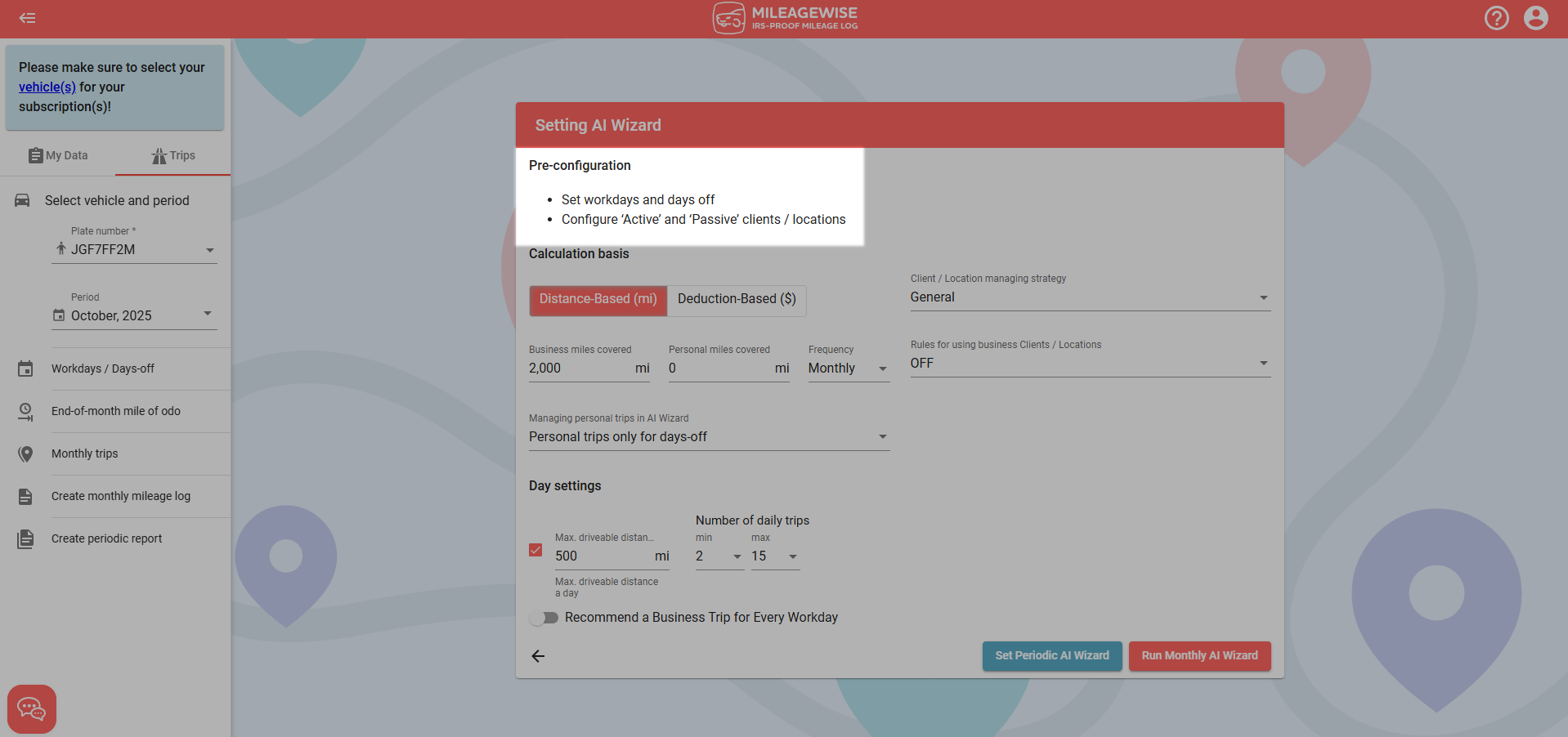 Then you need to set the parameters for the AI Wizard Mileage Log Generator feature by clicking on the AI Wizard button.