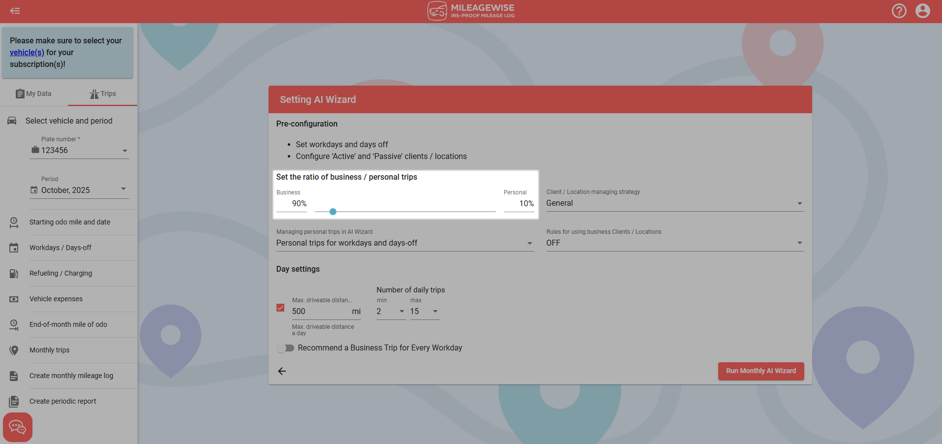 You can set your parameters based on your vehicle usage habits to reach your desired miles traveled and/or business-to-personal trip ratio. Based on your set parameters the AI Wizard feature will create an AI mileage log draft that you can review, correct, or accept right away if it fits your preferences.
