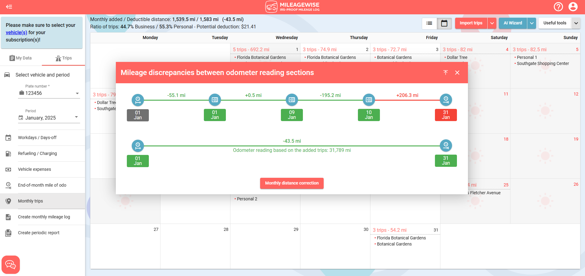 When the section turns green, click Monthly distance correction to fix minor remaining differences.