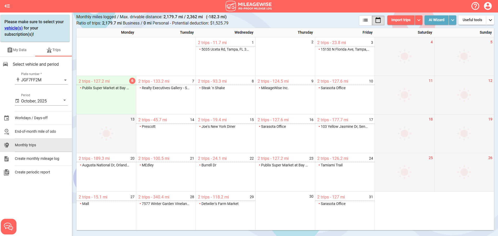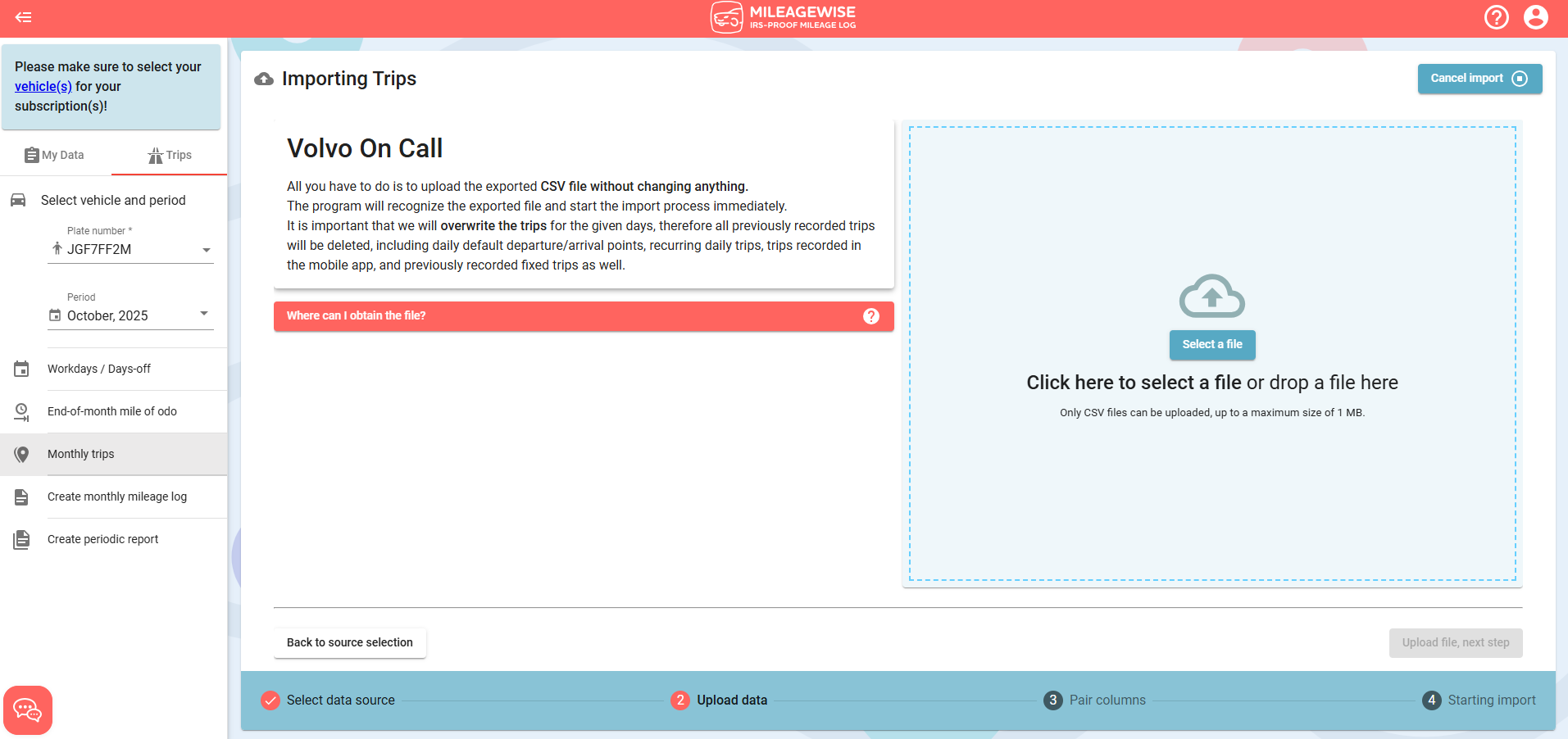 - Even if your file contains trips for multiple months, you can only import one month at a time. Make sure that you select the correct year and month within the system before starting the process. You can use the same document to import your trips separately for each month.