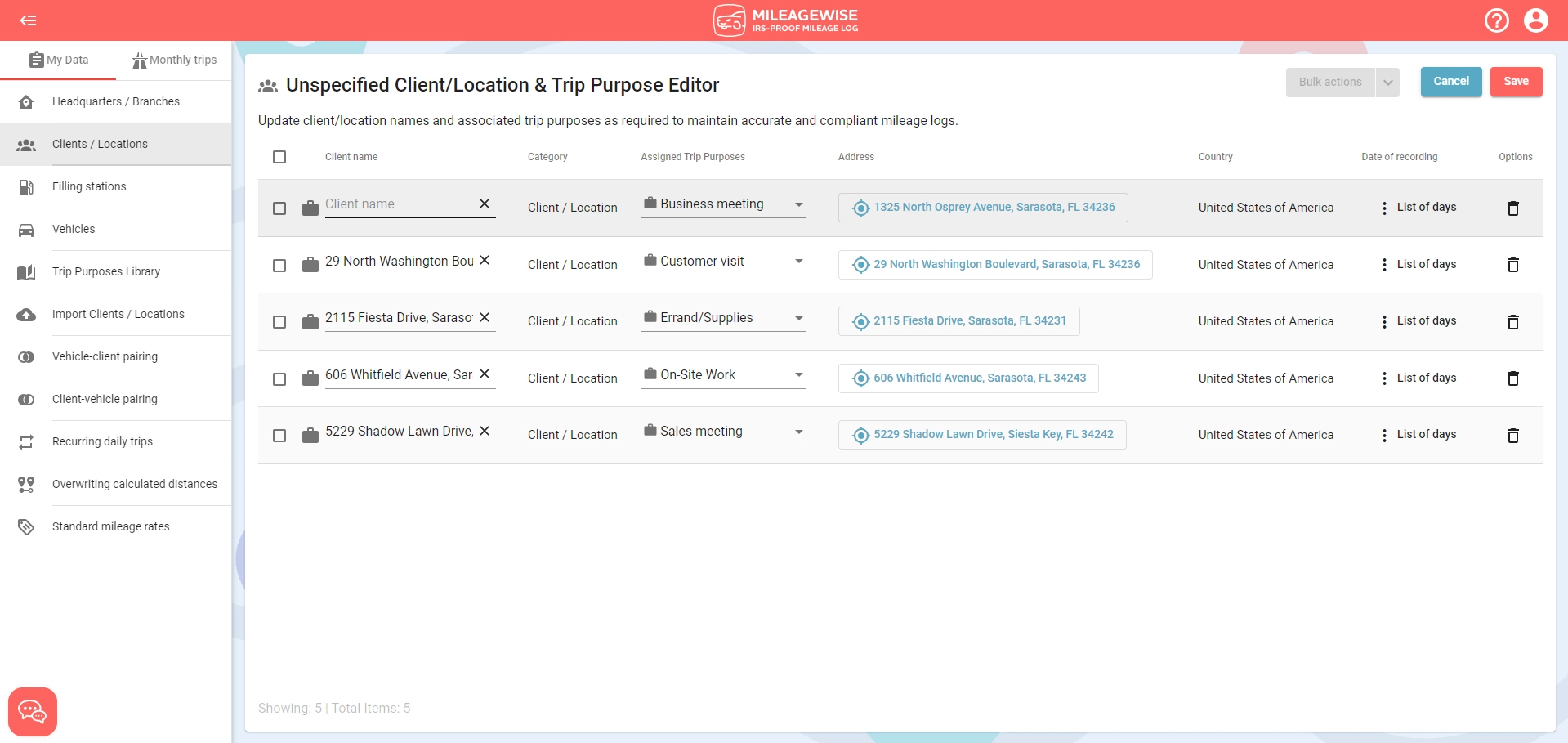 If you realize after logging your trips that a certain client or location has an incorrect category or trip purpose (such as being marked as “personal” instead of “business”), you can use this tool to quickly update it without needing to go through each individual trip.