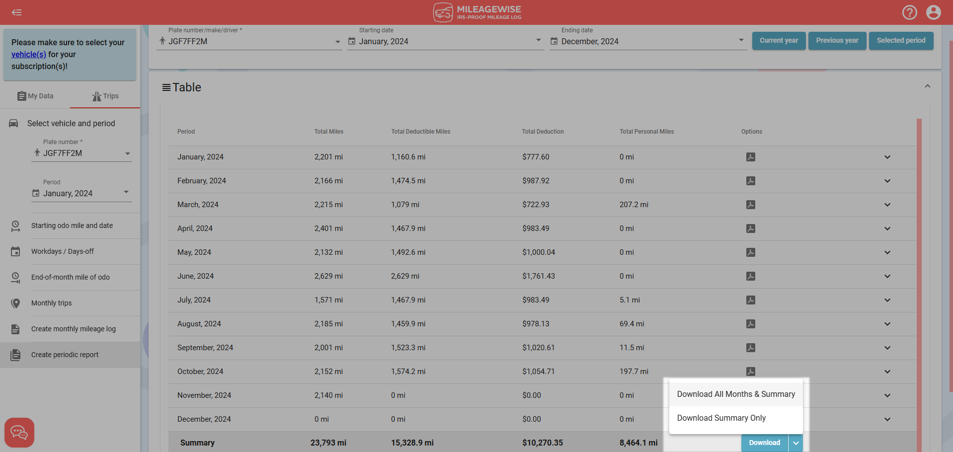 - The system will run the IRS Auditor check and generate monthly mileage logs for the selected period.