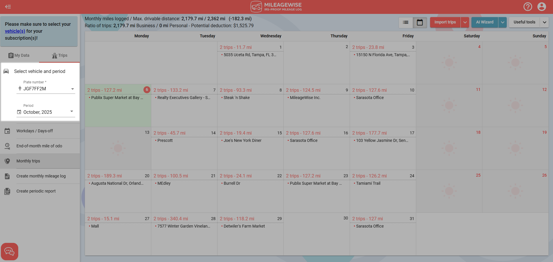 In the menu on the left, you can choose the vehicle and the month for which you would like to make a mileage log. You can enter your preferred vehicle and month in the Select vehicle and period on the left.